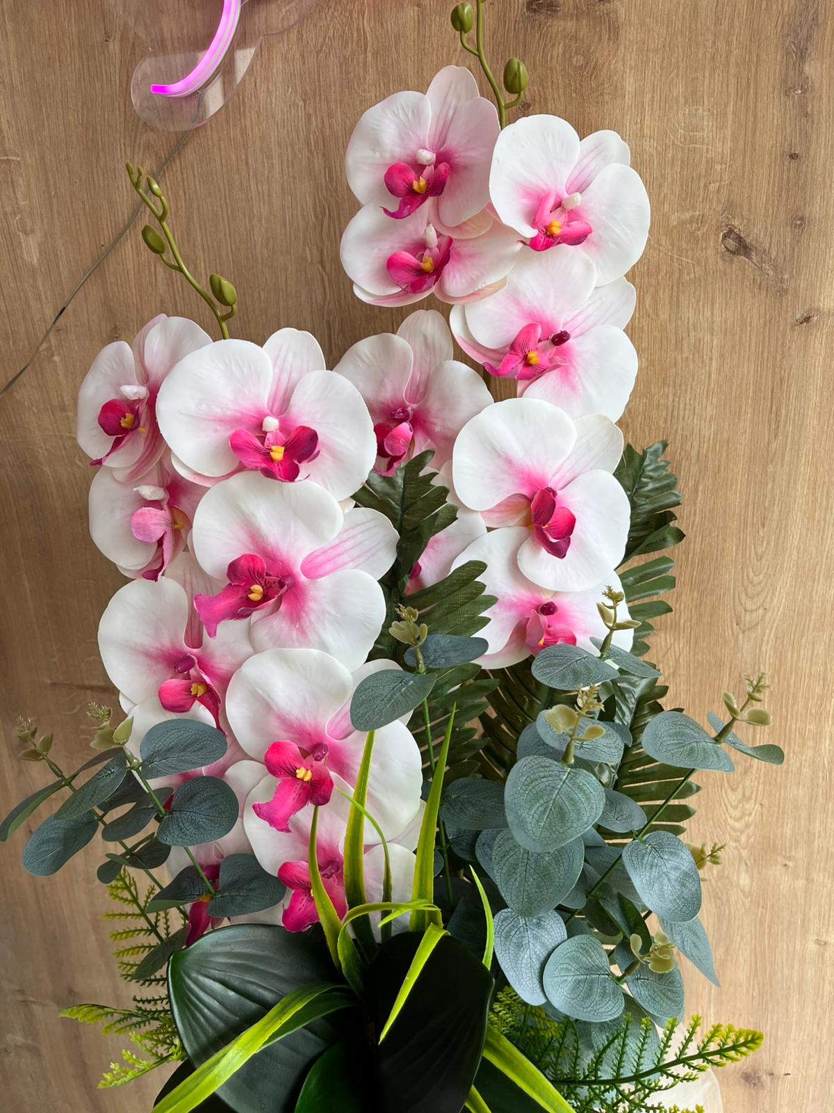 Siyah saksısı ile salon, ofis, antre veya çalışma alanlarında zarif ve sofistike bir duruş sağlar. Gerçekçi çiçek detayları ile doğal orkide estetiğini en şık şekilde yansıtır.